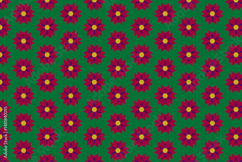 Stylish ornamental print ideal for textiles. A bold geometric red floral pattern on green background. Decorative pattern.