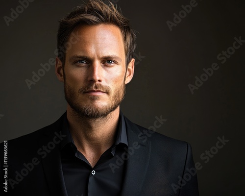 Stylish Portrait of a Charismatic Man in a Black Suit with Fresh Hair and a Unique Expression