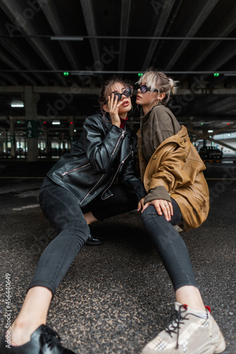 Stylish pretty model girl in fashionable denim clothes with a leather jacket and sunglasses posing on a parking lot in the city