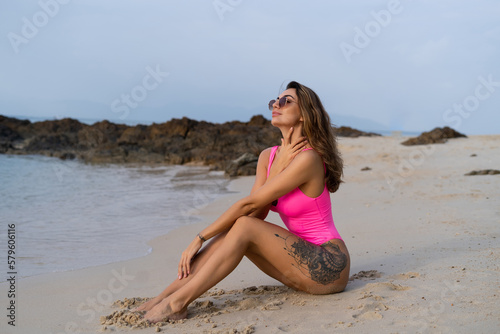 Stylish romantic tender, athletic body good shape, slim sensual woman in a pink swimsuit and sunglasses on the beach at sunset