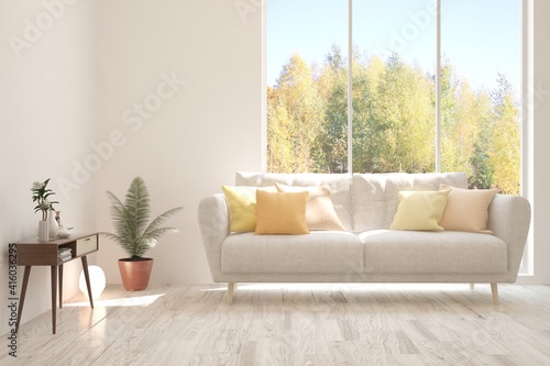 Stylish room in white color with sofa and autumn landscape in window. Scandinavian interior design. 3D illustration