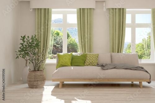 Stylish room in white color with sofa and summer landscape in window. Scandinavian interior design. 3D illustration