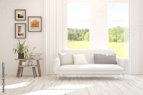 Stylish room in white color with sofa and summer landscape in window. Scandinavian interior design. 3D illustration