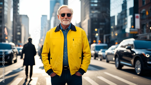 Stylish Senior Man in Bright Yellow Jacket and Sunglasses