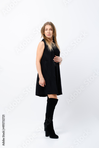 Stylish senior woman in loose dress posing in studio and looking straight