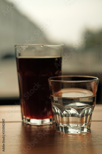 Stylish served specialty alternative black coffee. Filter pour-over coffee served in crystal glass and decanter. Aesthetics coffee