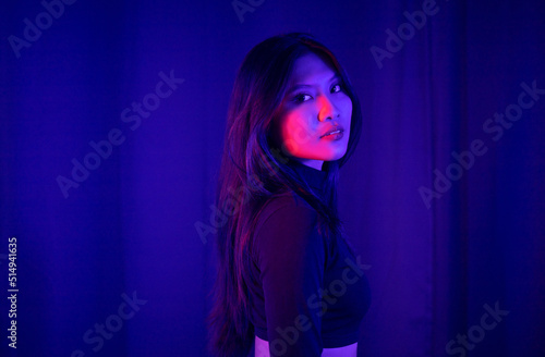 Stylish sexy woman in trendy. Beautiful young asian woman standing pose with neon light. Asia Pretty asian female in the dark room. Fashion shot.