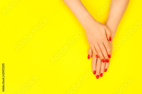 Stylish trendy red female manicure. Hands of a beautiful young woman on a yellow background. Beauty salon. Top view.