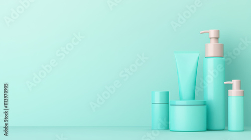 Stylish turquoise skincare containers arranged on mint background, creating fresh and modern aesthetic for beauty and wellness