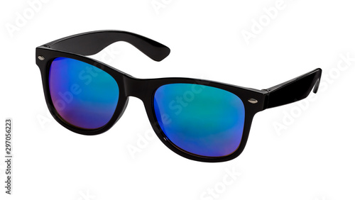 Stylish unisex sunglasses on a white background. View in half a turn..