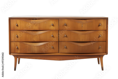 Stylish vintage wooden dresser with smooth lines and six spacious drawers, perfect for modern home decor.