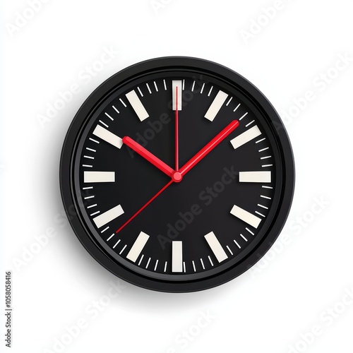 Stylish wall clock with black and white design and red hands, isolated on a white background.