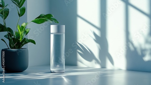 Stylish Water Bottle on Minimalist Table with Green Plant Shadow