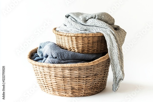 Stylish Wicker Baskets Stacked with Soft Clothes for Home Organization and Decor
