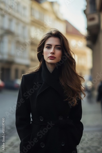Stylish Woman in Black Coat - Elegant Portrait on Prague Streets