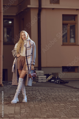 Stylish woman in knee-high boots poses confidently on a city street during golden hour in autumn