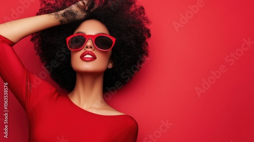 Stylish woman in red sunglasses poses confidently against a vibrant red backdrop, AI