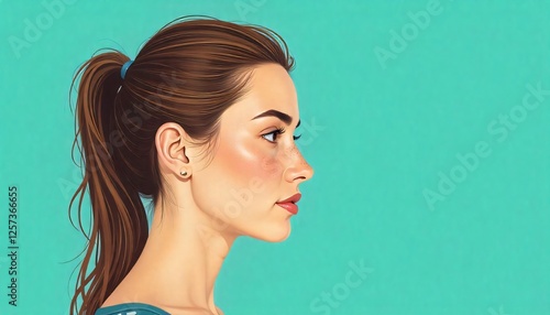 Stylish Woman Profile Brown Hair Ponytail Freckles Teal Background Digital Art Illustration