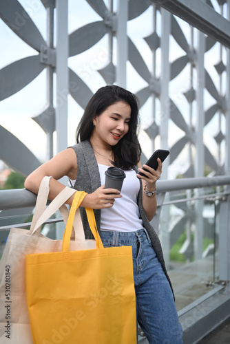 Stylish woman with shopping bags checking her smart phone standing on terrace of modern building