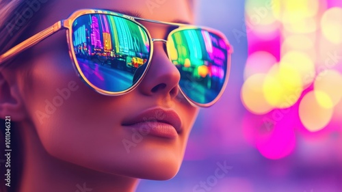 Stylish woman with vibrant sunglasses reflecting colorful city lights, embodying modern fashion and urban nightlife.