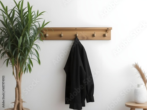 Stylish wooden coat rack with hanging jacket and vibrant green plant, creating a welcoming entryway ambiance for modern homes and businesses.