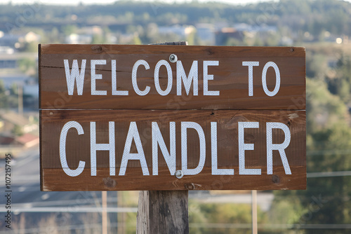 Stylish wooden "Welcome to Chandler" sign, ideal for US city entrance road signs, travel signage, urban landmarks, and city-themed branding projects.