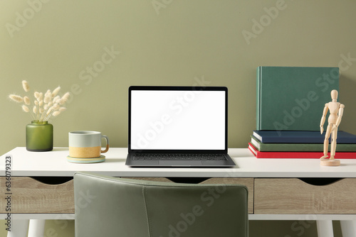Stylish workplace with laptop, cup and vase of dry decorative spikes on white desk near olive wall indoors