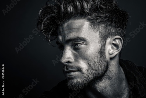Stylish Young Male Model Portrait with Chic Hairstyle Against Dark Studio Backdrop