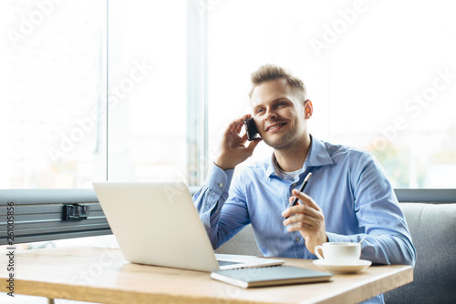Stylish young man calling by the phone to solve business problems. Online consultation by phone. Freelancer discussing the development and planning of his online project. Outsourcing. Mobile services.