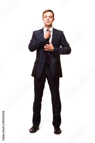 Stylish young man in suit and tie. Business style. Handsome man is standing, looking at the camera and fixing his tie