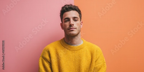 Stylish Young Man in Yellow Sweater Against Colorful Backgrounds