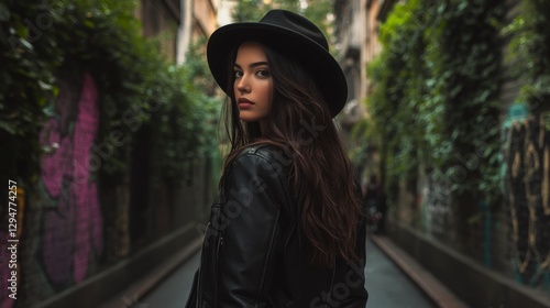 Stylish young woman in a black hat and leather jacket looks over her shoulder down a graffiti-covered alley.
