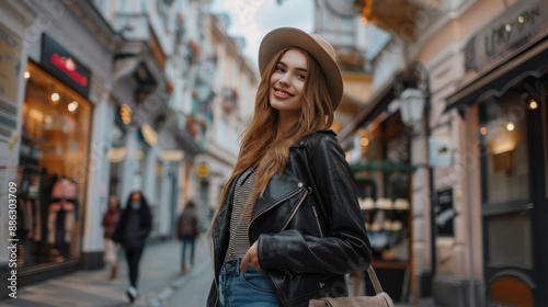 Stylish young woman in leather jacket, hat, jeans, boots, holding trendy bag on busy city street with shops, cafes.