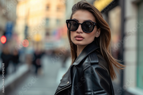 Stylish young woman in sunglasses on city street. Urban fashion.