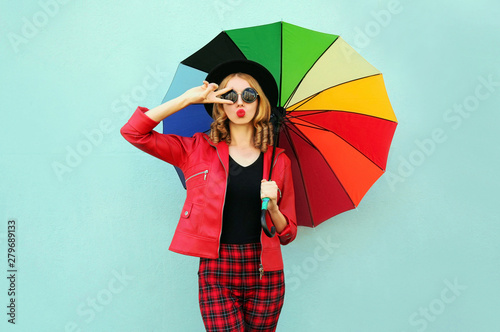 Stylish young woman with colorful umbrella blowing red lips sending sweet air kiss, wearing red jacket, black hat on blue wall background