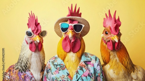 Stylishly dressed chickens in bold, trendy outfits, posing against a clean solid background, offering a fun and creative design for ads