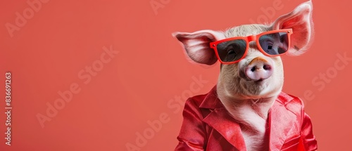 Stylishly dressed pig in colorful ensembles against a solid backdrop Great for creating a fun and trendy advertisement with ample copy space