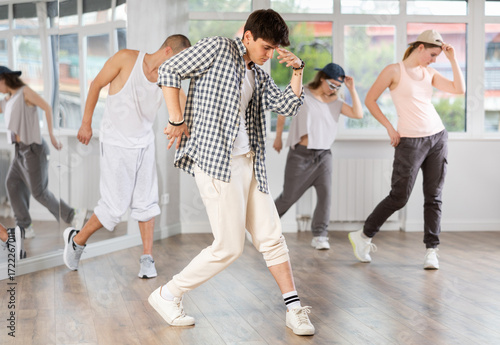 Stylishly dressed young people learn to dance hip-hop and breakdance in a dance studio