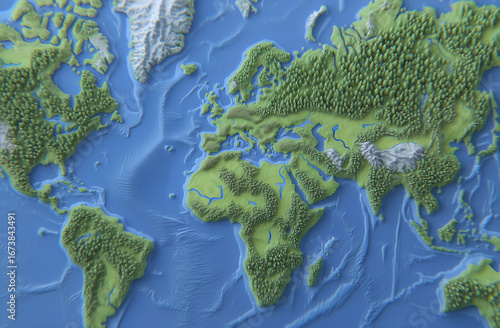 Stylized 3d relief map showcasing earth continents with elevated terrain details and natural landscape features