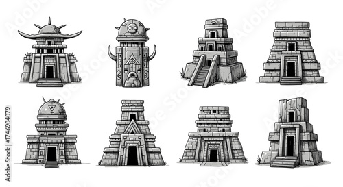Stylized Ancient Temples and Structures Featuring Intricate Architectural Designs