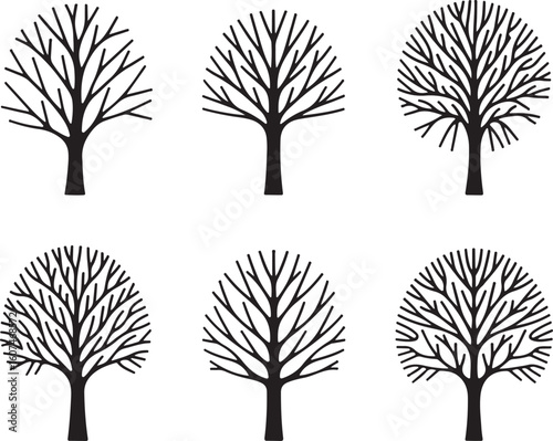 Stylized Bare Tree Silhouette Vector Set – Symmetrical Winter Branch Trees in Minimal Black Design