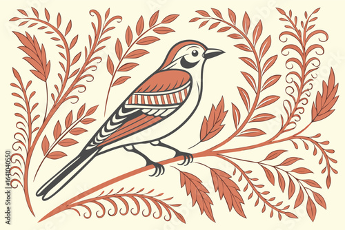 Stylized Bird on Branch with Foliage
