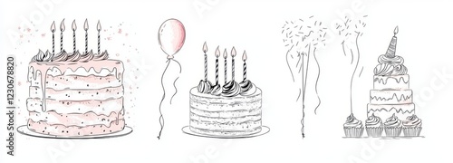 Stylized birthday cakes with color spots and decorations, illustrated in a cartoon outline sketch style