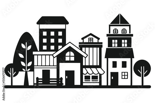 Stylized Black and White Cityscape with Houses and Trees