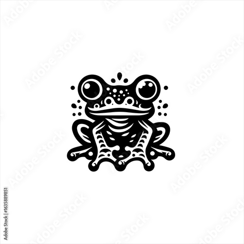 Stylized black and white frog illustration with tribal elements