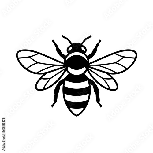 Stylized Black and White Honeybee Illustration with Detailed Wing Veins