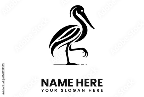 Stylized black and white illustration of a heron or stork standing on one leg.