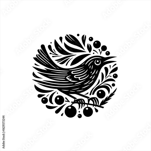 Stylized black bird perched on a branch surrounded by berries and leaves