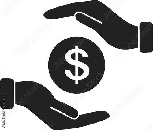 Stylized Black Hands Gently Cradling Coin with White Dollar Sign – Palm-Up Protective Gesture Representing Financial Care, Wealth Security, and Monetary Value – Minimalist Vector for Finance, Charity,