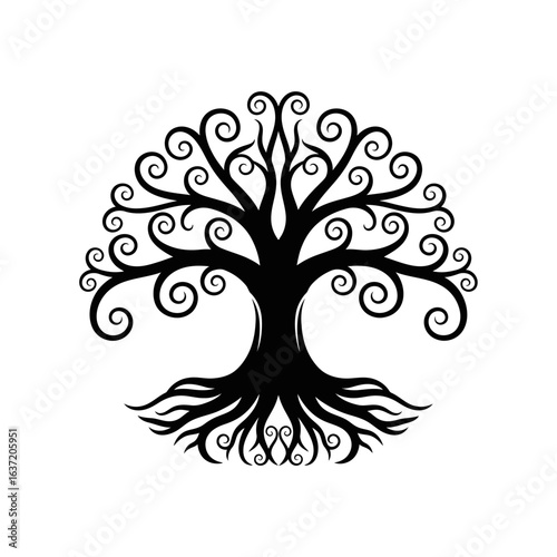 Stylized black silhouette of the Tree of Life with swirling branches and ornate roots.